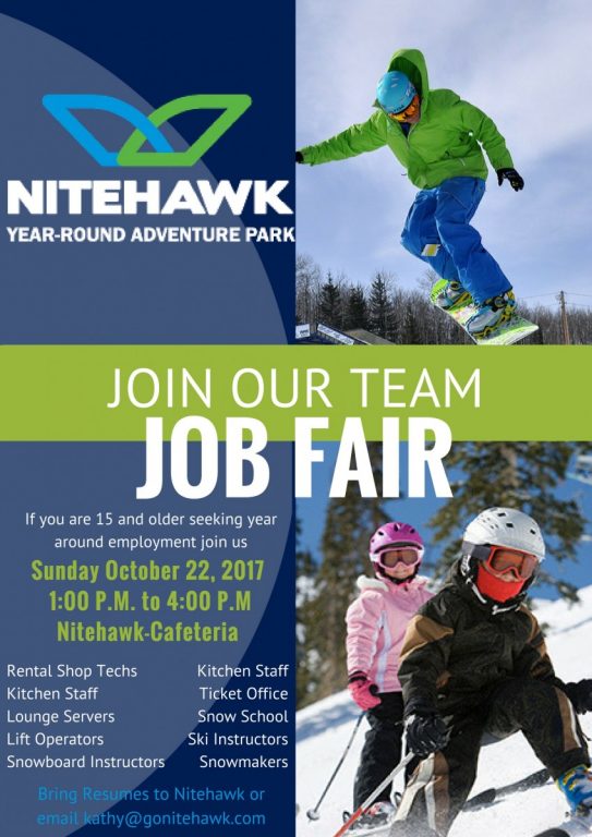 If you are 15 years and older, looking for employment, Nitehawk Year Round Adventure Park may have the job for you! Come join us at our hiring fair Sunday, October 22nd. We will have managers from every department on site to discuss the positions.