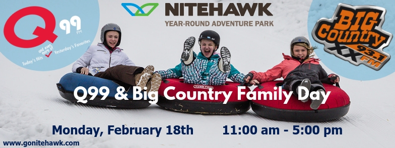 * $12/person/2hr Tube Zone Passes (due to limited capacity please reserve your spot online at: https://old.gonitehawk.com/events/calendar/q99-big-country-fm-family-day/)