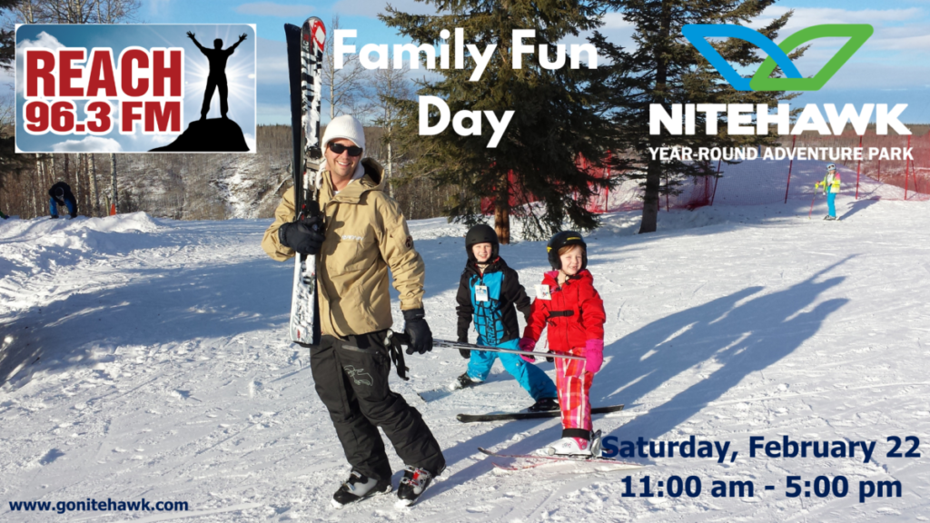 The “Reach FM Family Fun Day” at Nitehawk Year-Round Adventure Park, Saturday, February 23rd from 11:00am to 5:00pm.