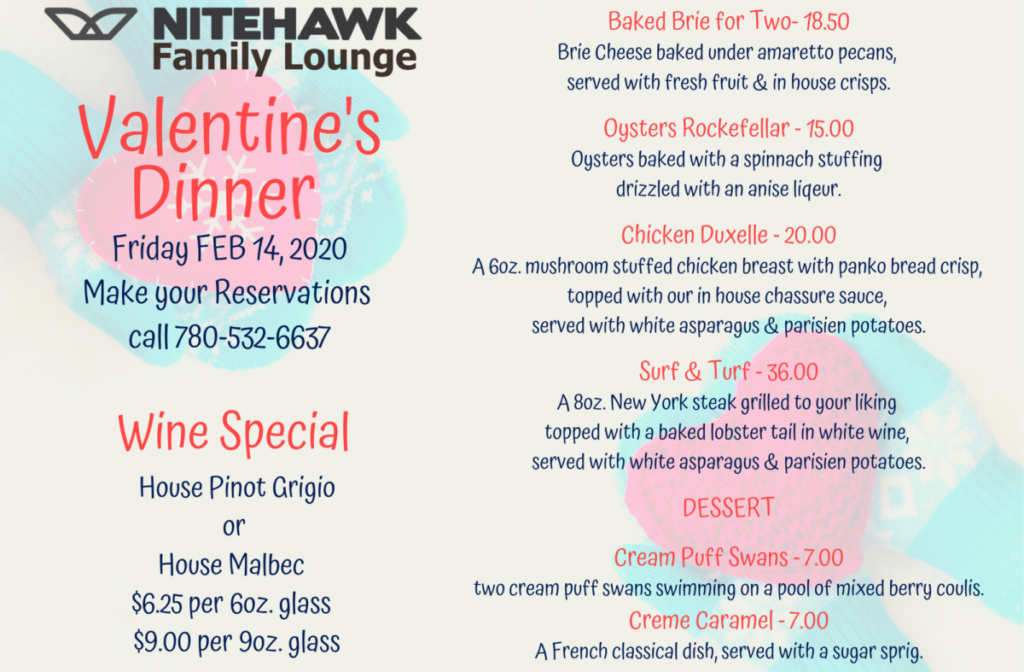 Dinner Reservations available at 6:00PM & 7:30PM, call 780-532-6637 to reserve your spot today. *FREE Valentines Gift for the first 30 couples that make their reservation in advance.